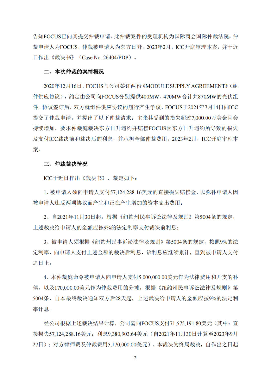 2021 年 7 月 24 日,东方日升接到 ICC 通知,告知 FOCUS 已向其提交仲裁申请;